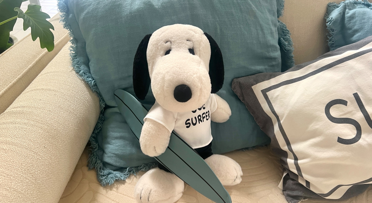 サーフボードを抱え、「JOE SURFER」のTシャツを着てシャカサインをするスヌーピーが目印。