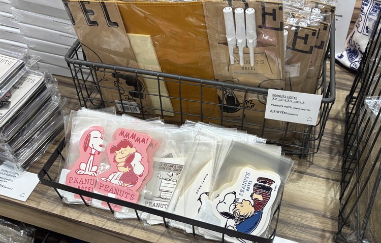 「PEANUTS HOTEL」のエリアには、客室で使用されているペンやメモなどのステーショナリーセットやステッカーが。