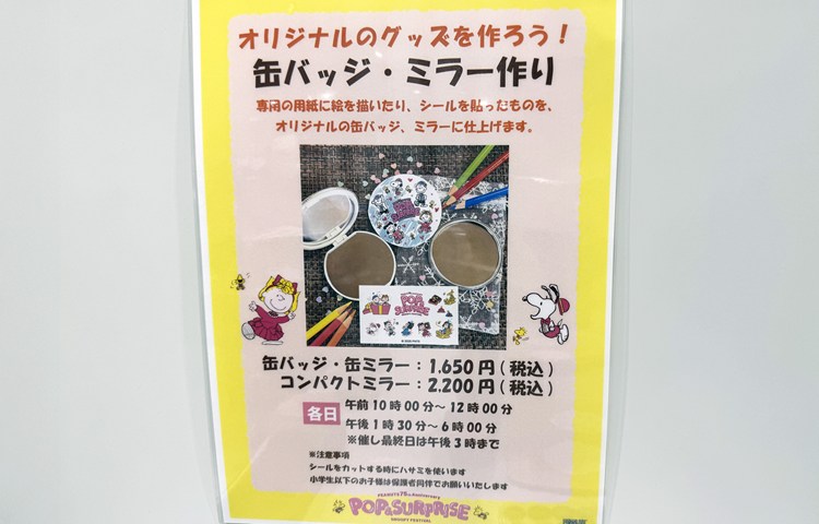 お好みの専用用紙に、色を塗ったりシールを貼って、缶バッジやミラーを仕上げるワークショップは、約15分ほどで完了する手軽さも人気。