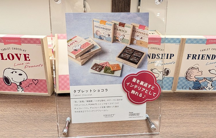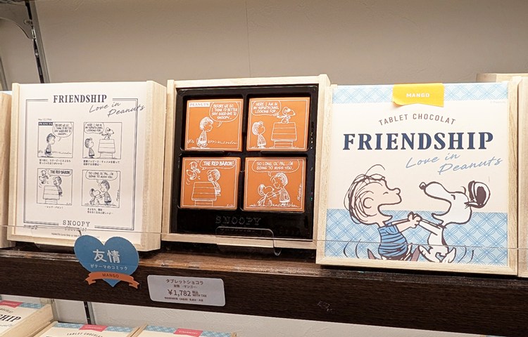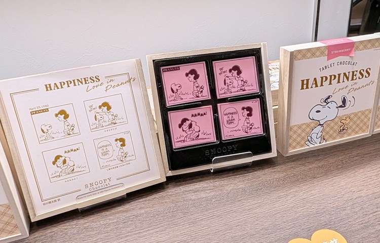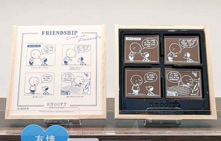 「恋(LOVE)」「友情(FRIENDSHIP)」「家族愛(FAMILY)」「小さな幸せ(HAPPINESS)」のテーマに合わせた、選りすぐりのPEANUTSコミックが、1コマずつチョコレートにプリントされています。