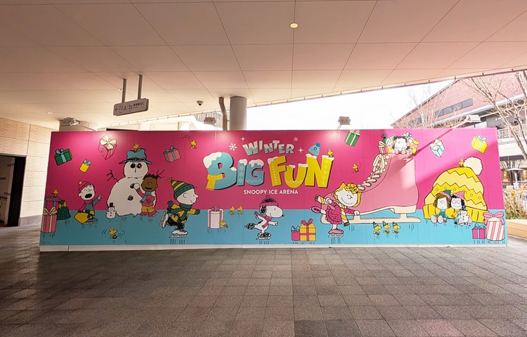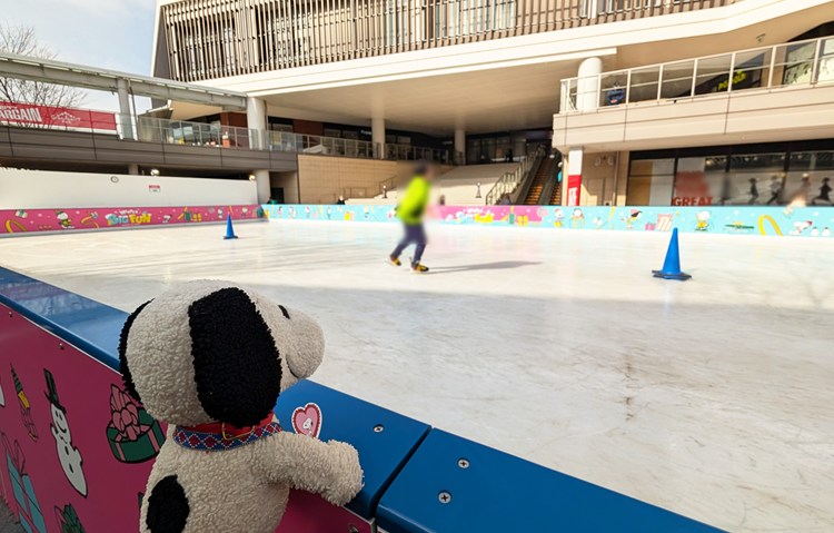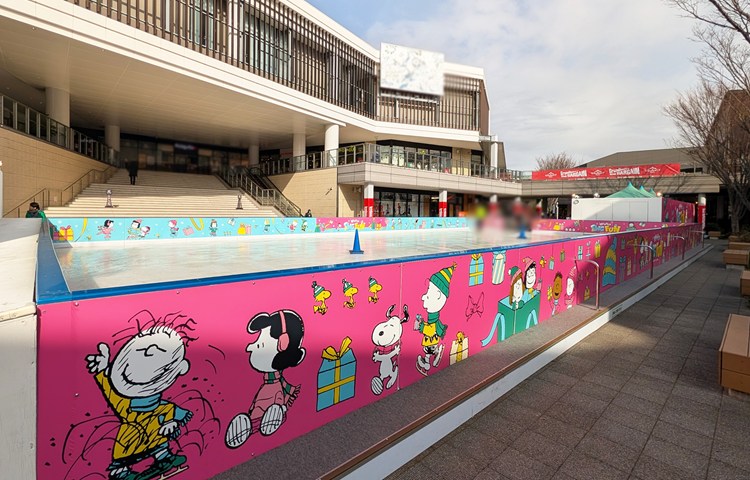 ウィンターシーズンを楽しむ、スヌーピーやピーナッツ・ギャングがぐるりと描かれている、広々としたスケートリンク。