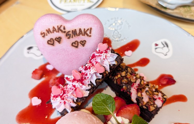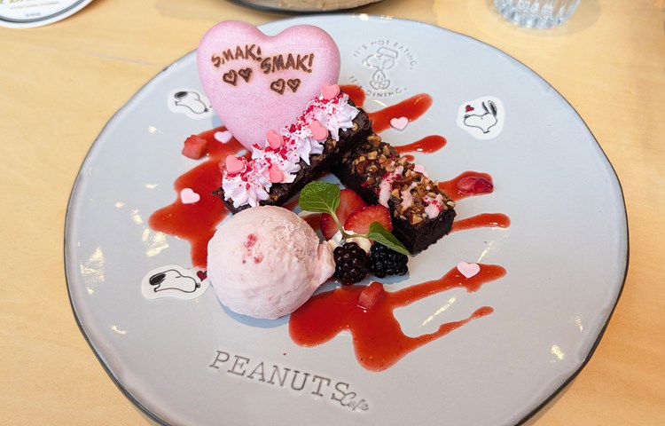 濃厚な自家製ブラウニーといちごのアイスクリームが爽やかな「スヌーピーの “SMAK!“ ブラウニー」。