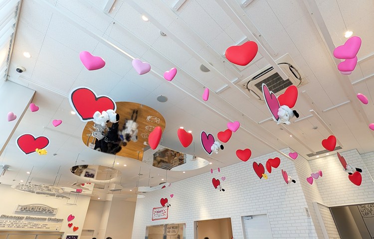 スヌーピーだらけの「スヌーピー・ウィンドウ」にも連なるように、ご覧の通りたくさんのハート、ハート、ハート!
