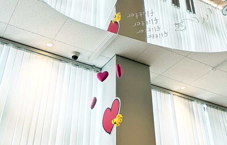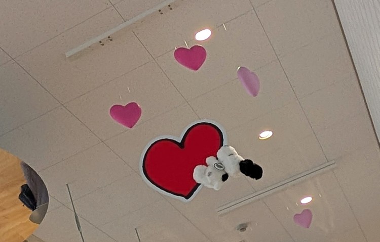 エレベーターを降りてすぐ出会える「スヌーピー・ふかふかレリーフ」にも、たくさんのハートが仲間入り。