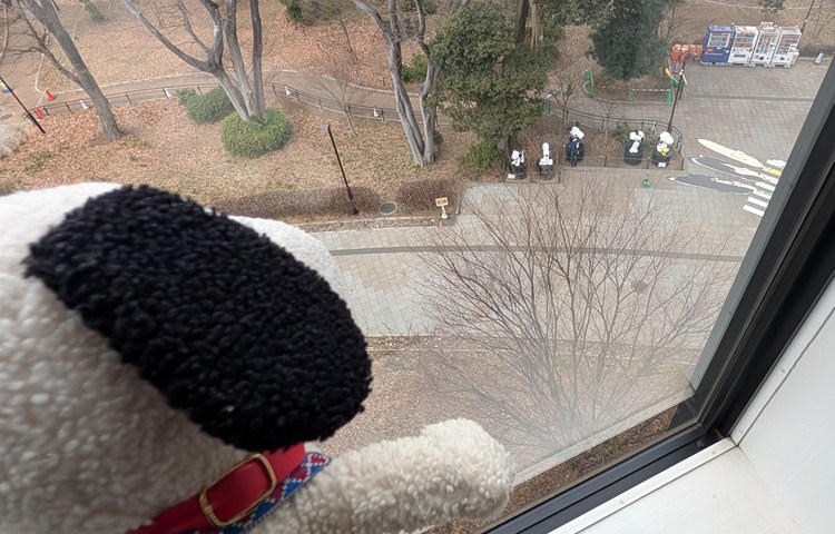 2階に降りる途中で、階段の窓から鶴間公園を眺めると、ミュージアムの裏手に並ぶスタチューが見えます。