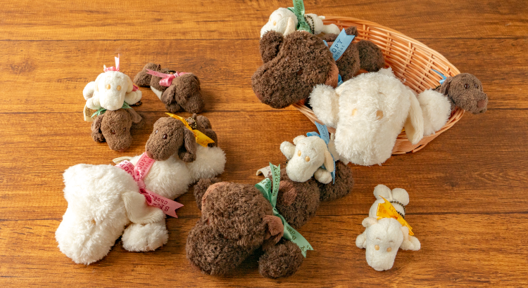 寝そべりポーズが可愛いオールブラウンとオールホワイトのぬいぐるみ・マスコット。