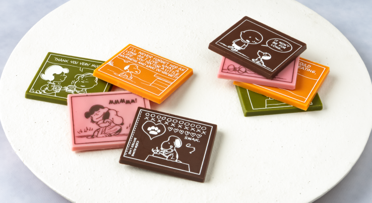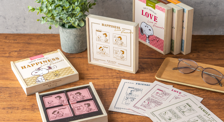 「恋」「友情」「家族愛」「小さな幸せ」のテーマに合わせてチョイスしたPEANUTSコミックを1コマ1コマチョコレートに。