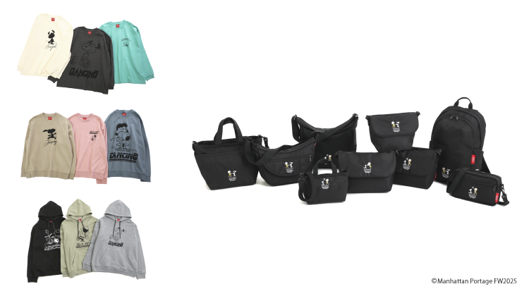 チャーリー・ブラウンとスヌーピーの2ショットをあしらった特別なバッグに加え、“DANCE”をテーマとし、ヴィンテージアートからダンスを連想させるモチーフを採用したアパレルラインが揃います。