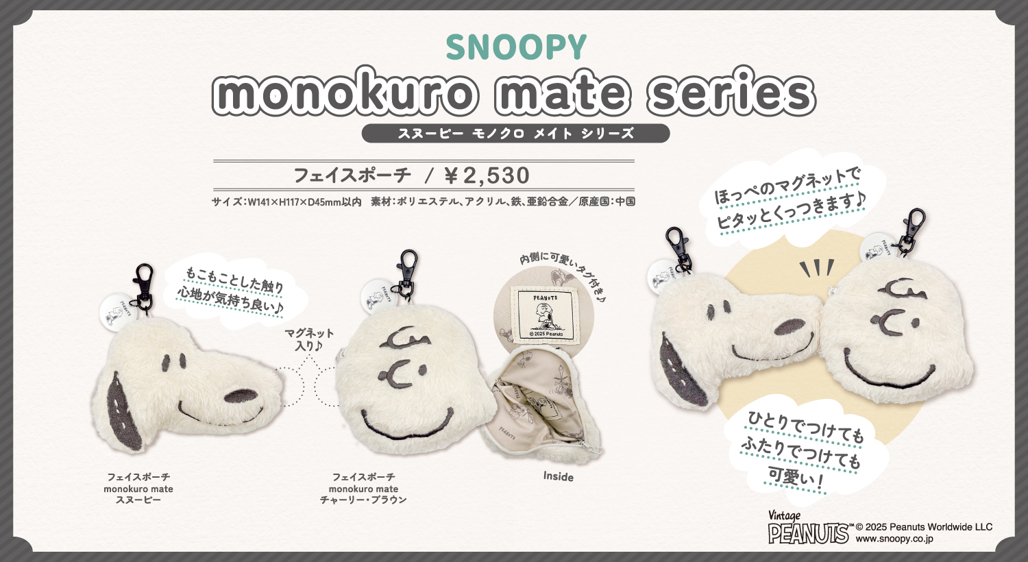 もこもことした触りごごちの「フェイスポーチ」は、スヌーピーとチャーリー・ブラウンのデザインをご用意しています。