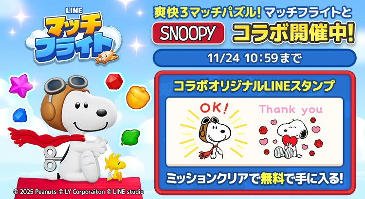 3マッチパズル「LINE マッチフライト」とコラボ開催!スヌーピーのスタンプなどを手に入れよう♪(株式会社テレビ東京コミュニケーションズ)