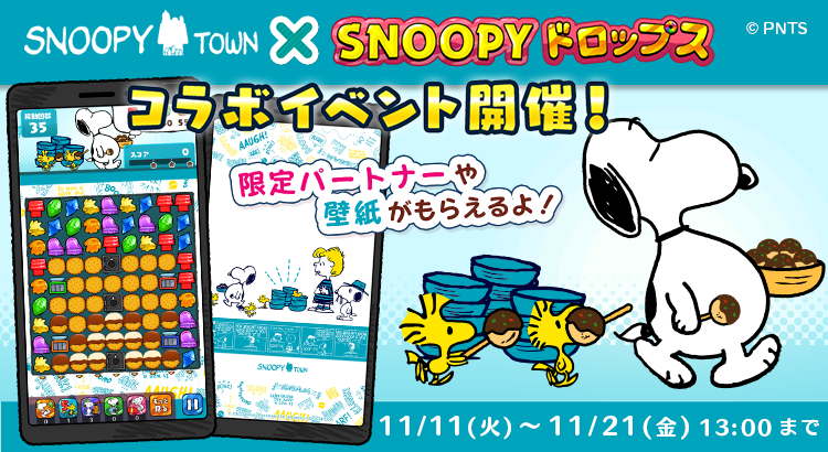 爽快パズルゲーム『スヌーピードロップス』にて、「スヌーピータウンショップ」とのコラボイベントを11月11日(火)13:00より開催予定!