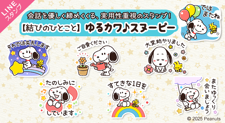 LINEスタンプに新作 『【結びのひとこと】ゆるカワ♪スヌーピー』 が登場!(株式会社テレビ東京コミュニケーションズ)