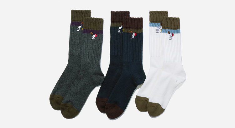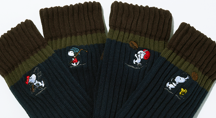 「スポーツの秋」をテーマに、スヌーピー発祥の地アメリカの4大スポーツ(野球、アメリカンフットボール、バスケットボール、アイスホッケー)に取り組むスヌーピーをリブソックスに刺繍で表現しました。