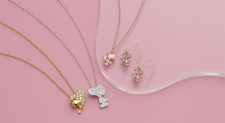 ハートにハグするスヌーピーがニッコリと微笑むデザイン。ペンダントにはダイヤモンドが1石キラリと輝きます。