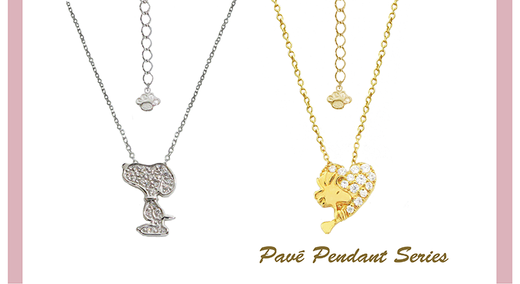 キュービックジルコニアが、光を受けてきらっと輝くスヌーピーとウッドストックのキラキラパヴェペンダント、ピンクゴールドカラーが可愛い、スヌーピーのプチペンダントとプチピアスが新登場。