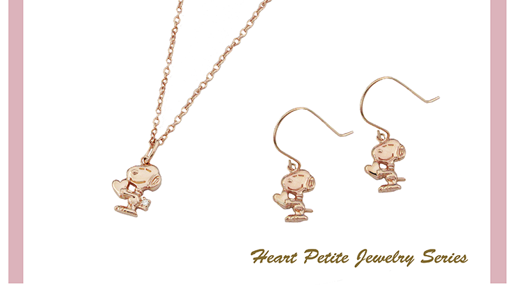 ピンクゴールドカラーが可愛い、スヌーピーのプチシルバーペンダントとピアス。