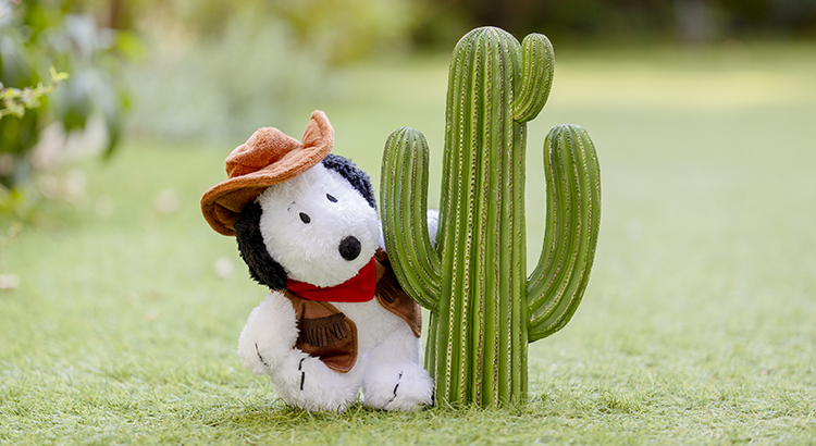 ウエスタンハットとベストがバッチリキマったオシャレなスヌーピーのぬいぐるみポーチ。