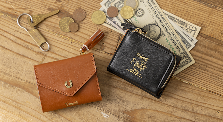 馬蹄のパーツがポイントの、いいことありそ、な午年財布。木馬で遊ぶスヌーピーとウッドストックのデザインが高級感のあるゴールドで箔押しされたコンパクトなお財布。