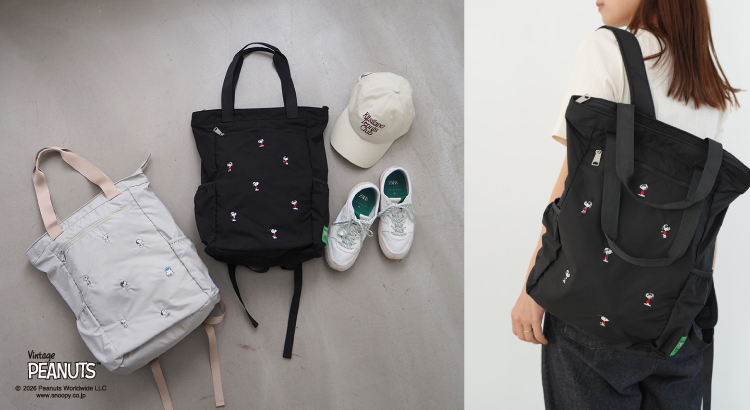 SNOOPYの小さな刺繍がかわいい2WAYバッグ。ベージュにはスヌーピーと兄弟たち、ブラックにはJOE COOLの刺繍をちりばめました。