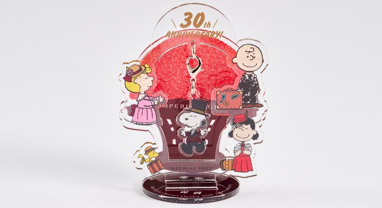 ホテルのメインロビーの装花として人気の、赤いバラのプリザーブドフラワーを背景に、帝国ホテル 大阪の開業当時のドアマンの制服を着た「ドアマン・スヌーピー」と、仲間たちをあしらったアクリルスタンドを作成しました。