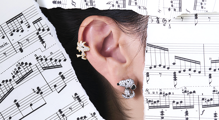 全体に贅沢にセッティングされたダイヤモンドが、スヌーピーの柔らかなフォルムを際立たせ、耳や首輪などのアクセントにはブラックダイヤモンドを使用。