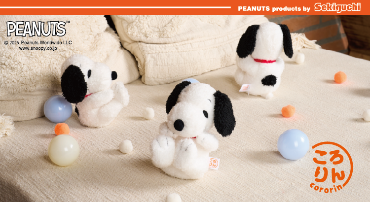 ぽてっとした新しいかたちのスヌーピーのぬいぐるみと、ころころ気ままに遊んでみてください♪